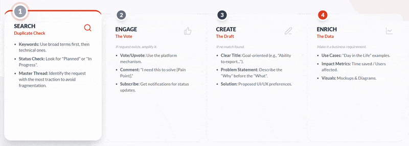 Upon receiving a request, first determine if the idea or feature already exists. You can do this by scrolling through the board or using the search functionality to locate similar issues.